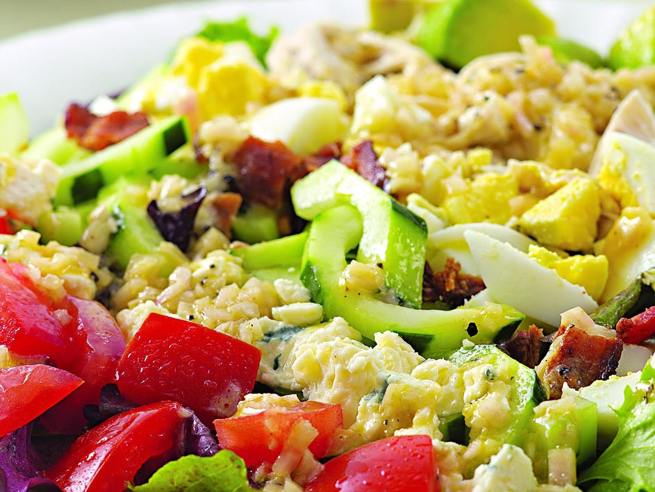 This Cobb salad is true to the original with all the good stuff—chicken, eggs, bacon, avocado and a tangy dressing. But we cut the saturated fat in half and doubled the amount of healthy monounsaturated fat. We’ve left the blue cheese optional, but the salad is so nutritious you might just want to go ahead and indulge yourself with a little bit anyway.