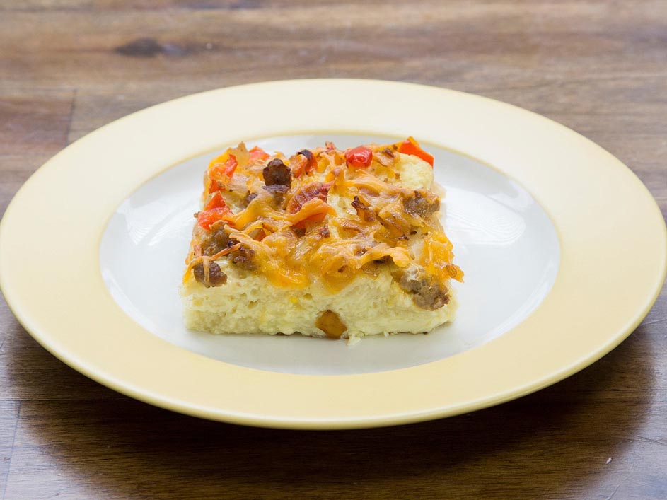 5. Arrange bread in a single layer in prepared baking dish. Pour egg mixture over bread and top with reserved vegetables and sausage. Sprinkle with remaining 1/3 cup Cheddar. Cover with plastic wrap and refrigerate for at least 5 hours or overnight.