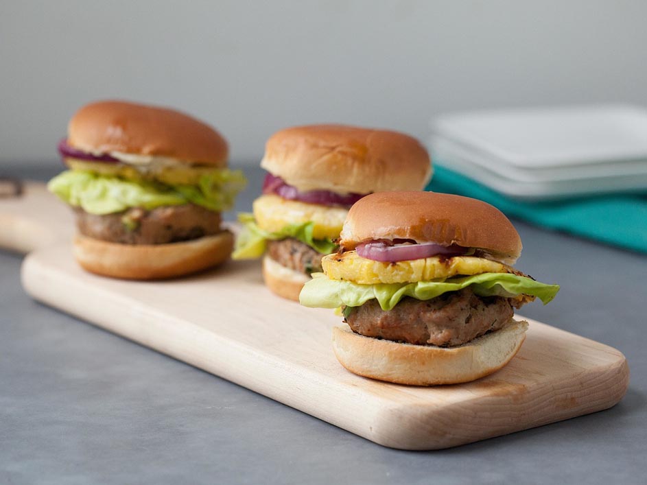 Grilled pineapple tops flavorful turkey burgers to give this easy slider recipe Hawaiian flair.
