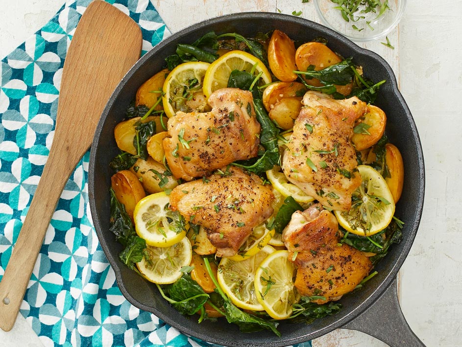 This easy one-pan skillet-roasted lemon chicken is perfect for weeknight dinners. Juicy chicken thighs are cooked in the same pan as baby potatoes and kale for a satisfying meal with the added bonus of minimal cleanup.